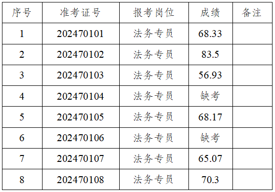 根据《梅州市企信融资担保投资有限公司2024年公开招聘公告》确定之招聘实施方案,我司于2024年7月4日实施了招聘人员面试流程。法务专员岗位面试应到8人,实际到考6人,缺考(弃权)2人。现将“法务专员”岗位的面试成绩公布如下: